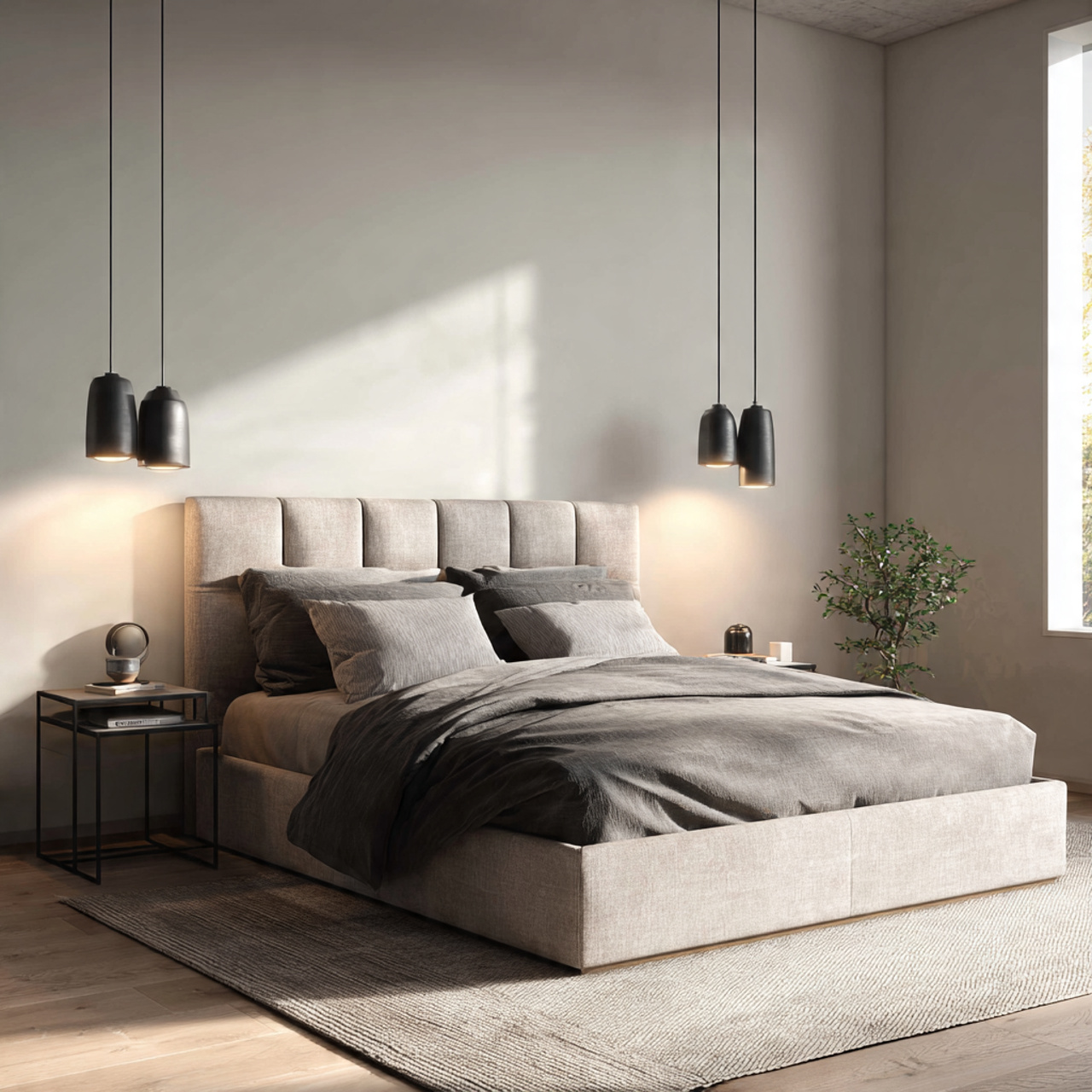 Pendant lights suspended from the ceiling above your nightstands offer a highly fashionable and effective alternative to conventional lamps. This innovative approach maintains all the space-saving benefits of wall sconces while adding a distinct vertical interest that draws the eye upward, making the ceiling seem higher.
