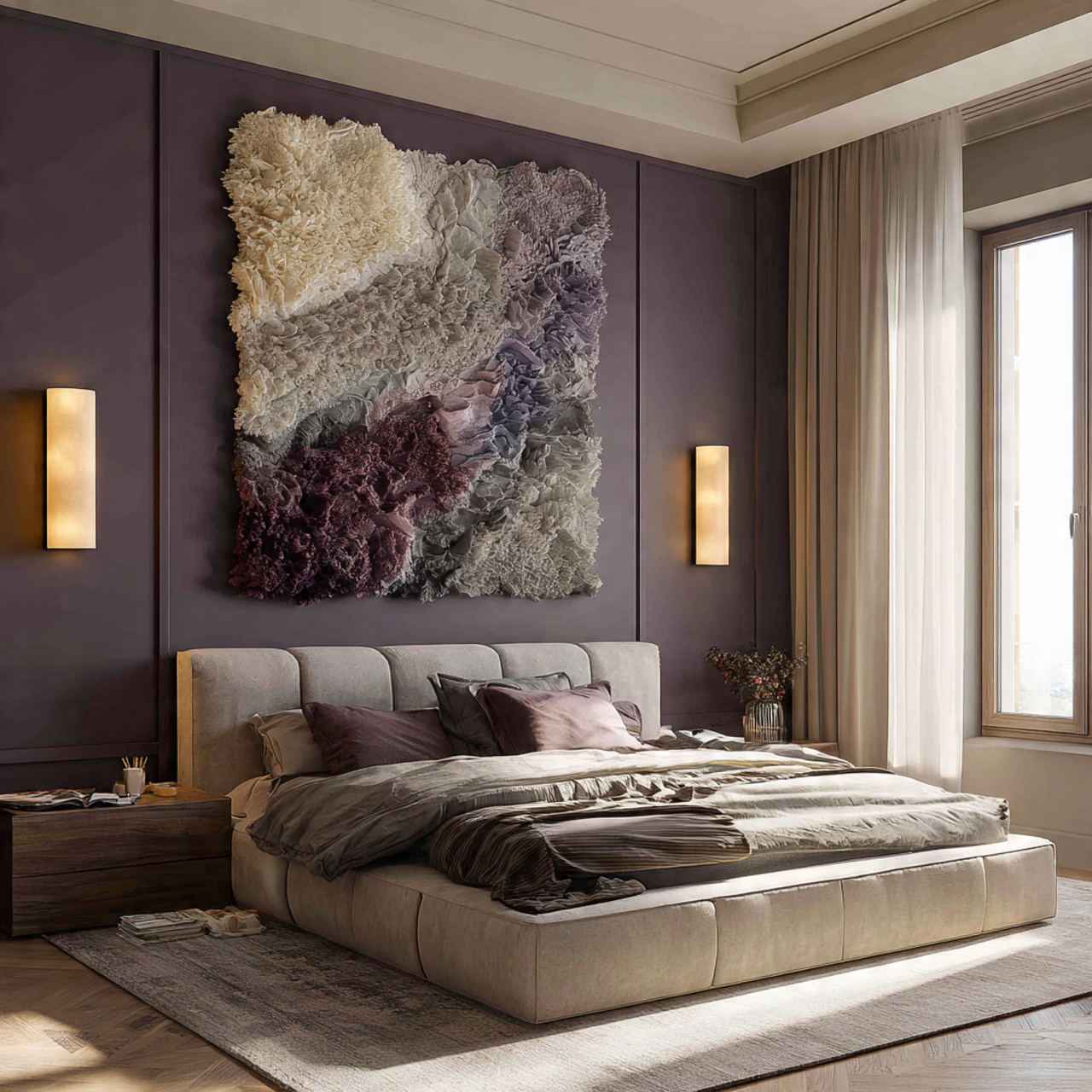 If the walls are already a dark purple, large-scale, minimalist DIY art can add personal flair without clashing with the intense backdrop. Consider creating abstract texture art using plaster or modeling paste on canvas, then painting it in subtle shades of pale gray, white, and a hint of lighter purple. The texture will pop beautifully against the flat, dark wall.