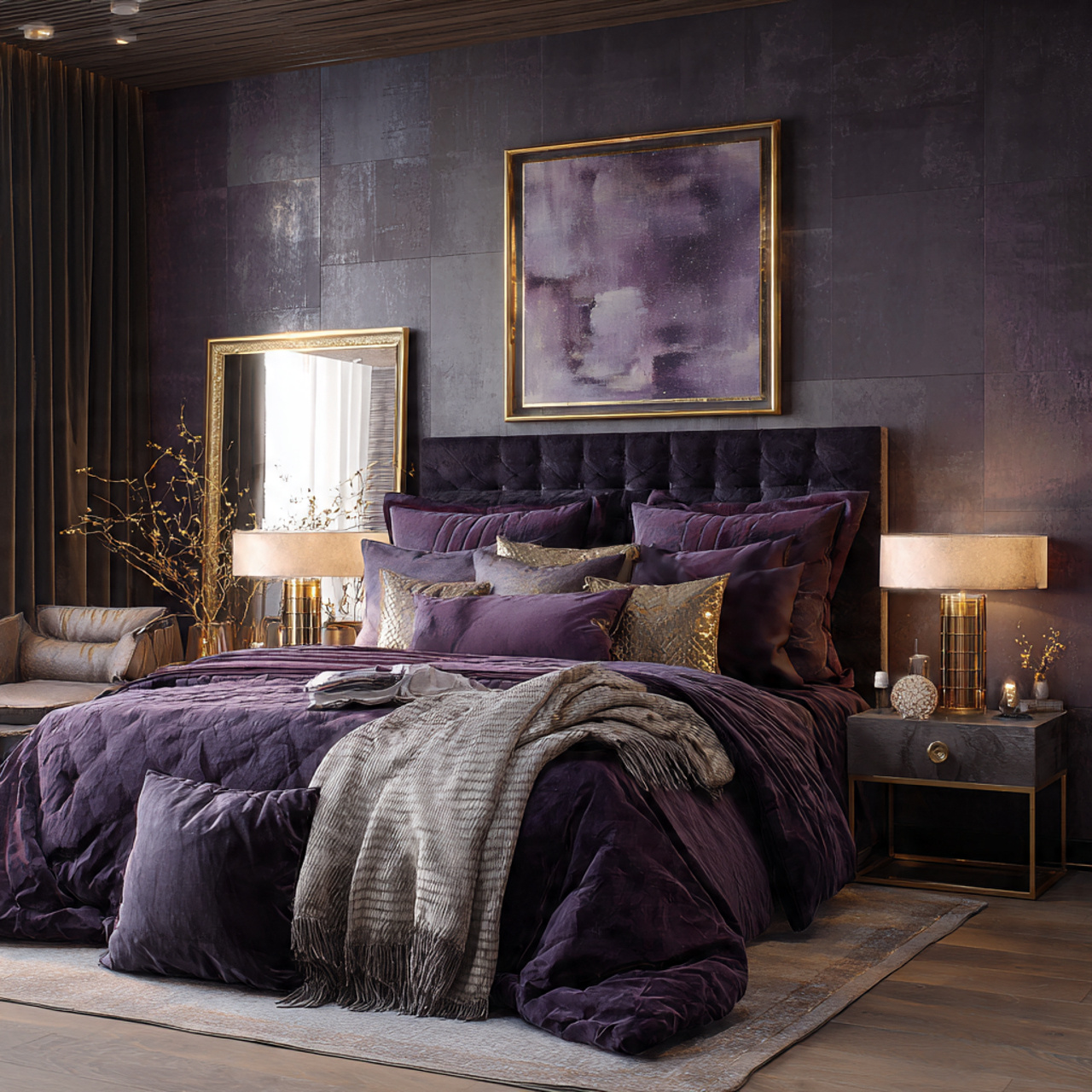 Dark purple is known to have a calming and soothing effect on the nervous system, as it blends the passion of red with the serenity of blue, making it an excellent color choice for a sleeping environment. It is psychologically associated with luxury, wisdom, and deep contemplation, encouraging relaxation and a shift toward rest.