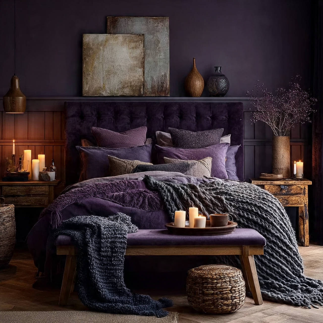 The grape color palette—deep, earthy purple with hints of brown and wine red—is the perfect match for rustic wood elements. The richness of the purple complements the raw, organic texture of reclaimed wood beams, rough-sawn nightstands, or a wooden feature wall. The natural grain of the wood adds necessary warmth and texture.