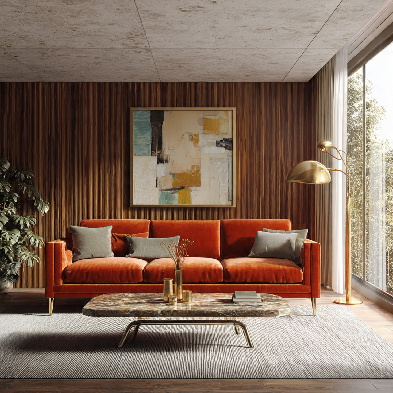 To ensure warmth, prioritize rich textures like wool, tweed, and leather in upholstery and textiles, and make extensive use of walnut wood furniture. Introduce rich jewel-toned colors like burnt orange or deep teal with throw pillows and rugs, and use warm-toned lighting from sculptural lighting fixtures to soften the straight lines.